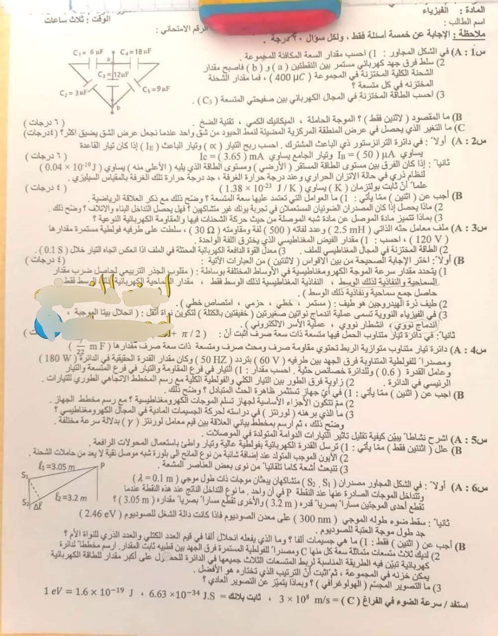 اسئلة فيزياء السادس علمي 2025 الدور الاول